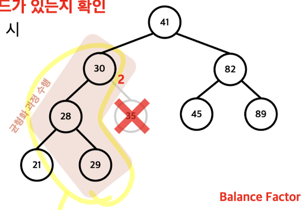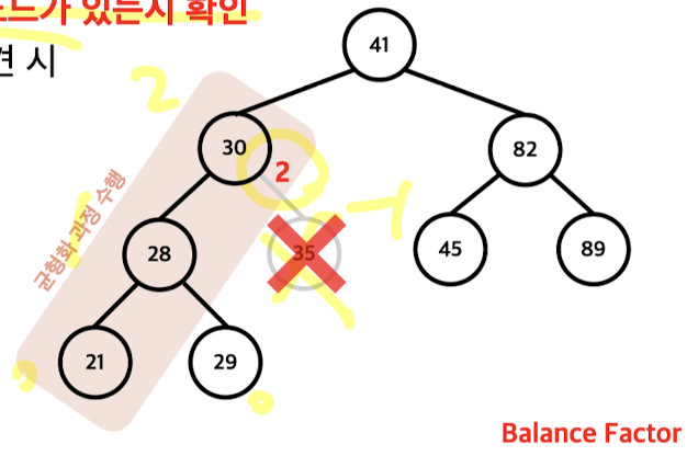 2. 삽입된 노드에서 시작하여 루트 노드까지 Balance Factor의 절대값이 1을 넘는 노드가 있는지 확인
