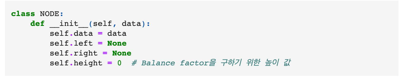 1. Node Class : data, left, right, height 값