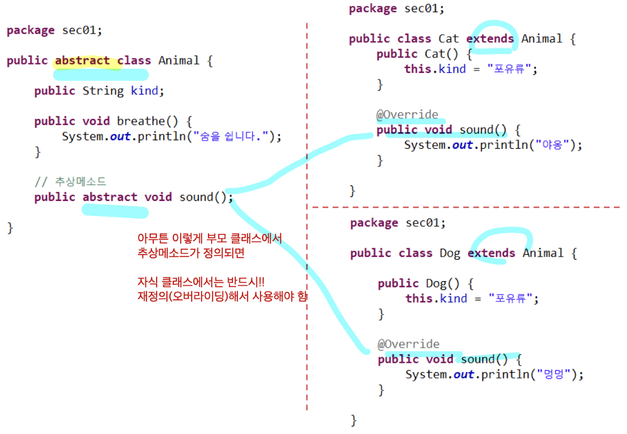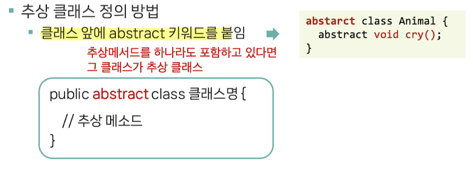 - 반드시 자식클래스에서 메서드 재정의(오버라이딩) 해줘야함