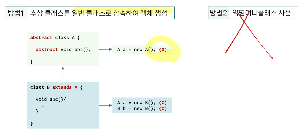 - 부모 역할만 수행 ( 반드시 추상메서드를 재정의하는 자식이 필요하므로 ) = 즉, 부모클래스이다