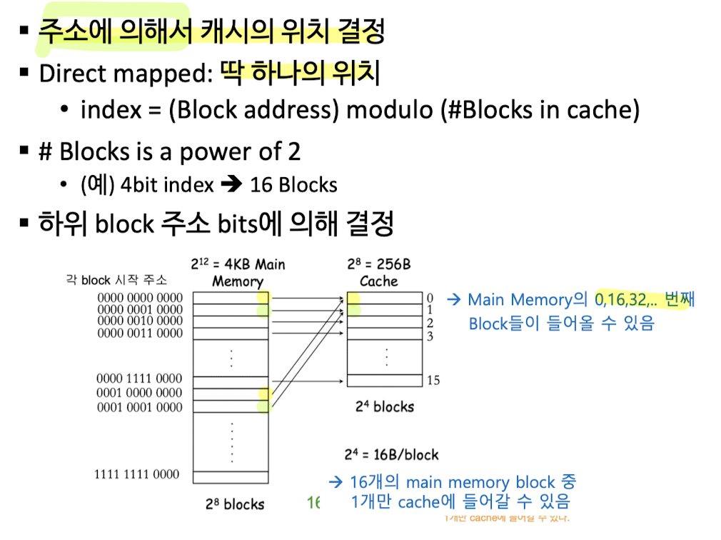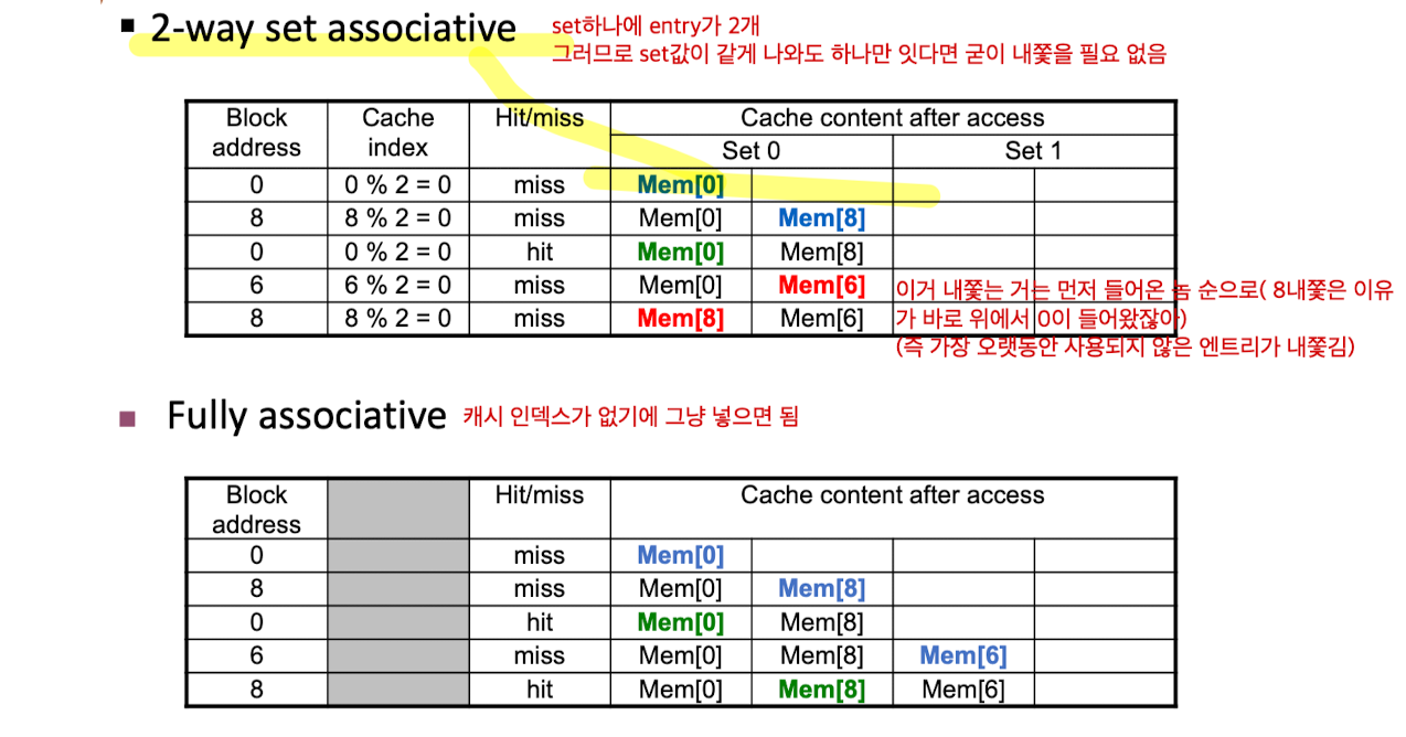 ➡️ Fully 에서는 블록이 캐시 어느 곳에나 들어갈 수 있지만, n-way는 set내에서만 들어갈 수 있다