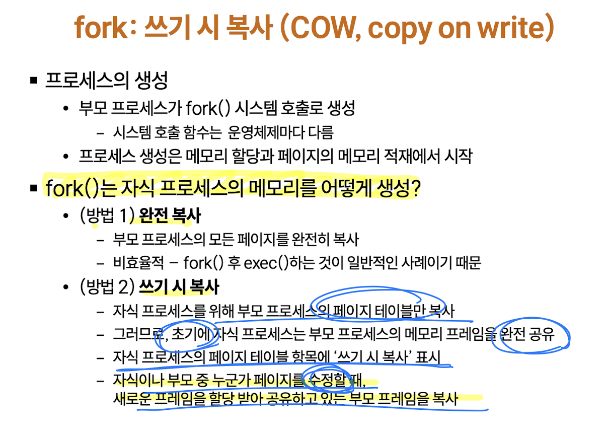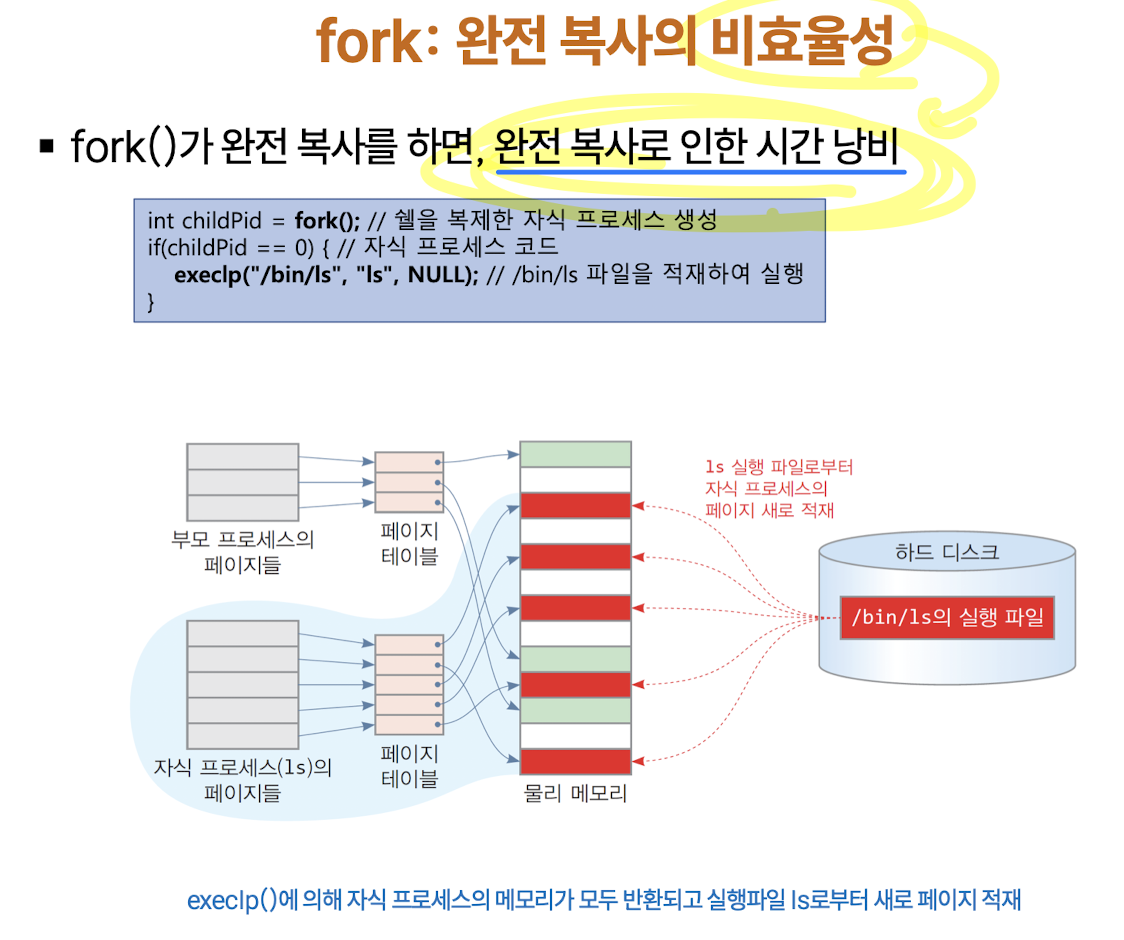 : 부모 프로세스의 페이지 테이블만 복사하여 자식 프로세스를 만들기 떄문에 프로세스 생성이 매우 빠름