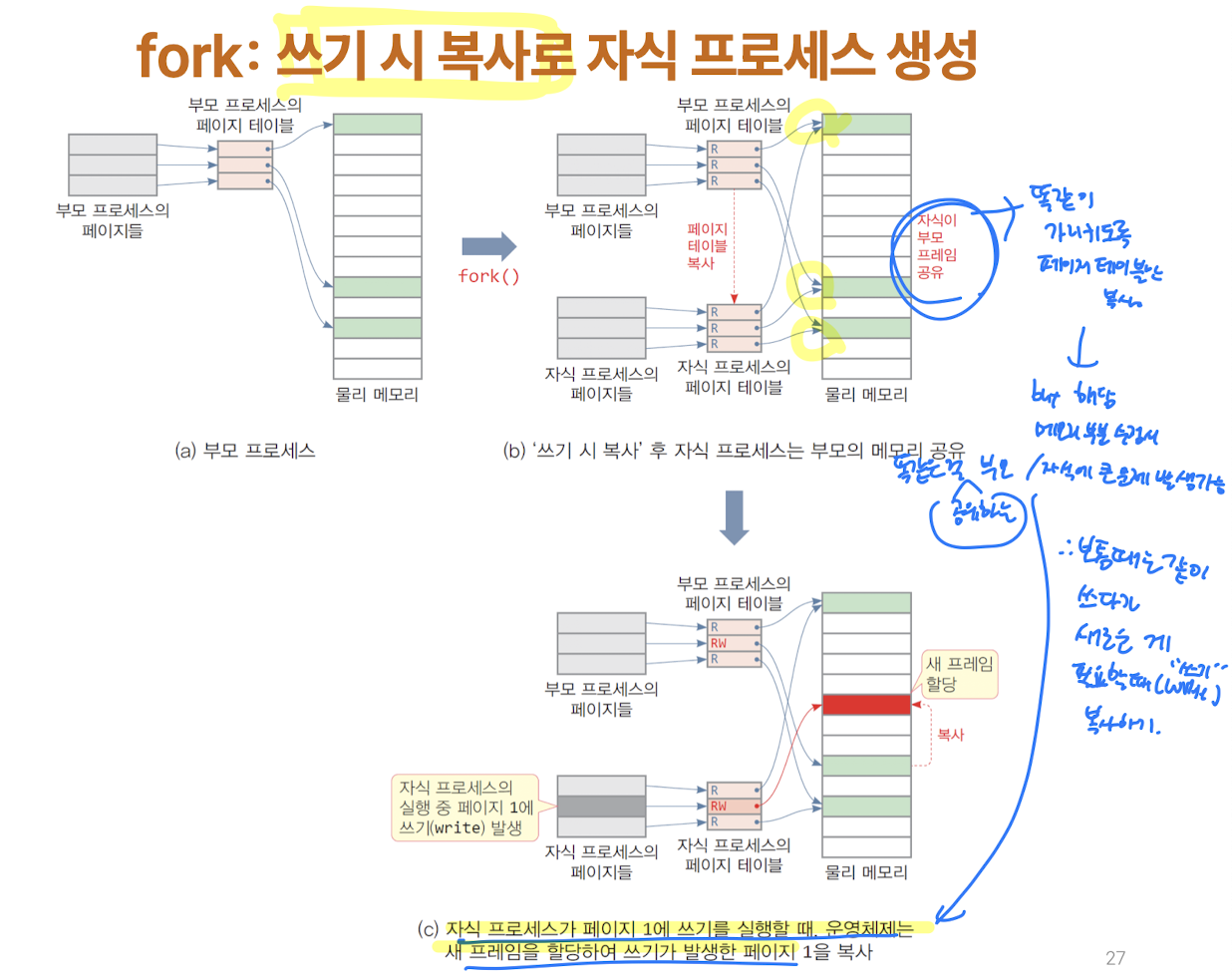- 부모 프로세스와 자식 프로세스는 동일한 메모리 페이지를 공유합니다.