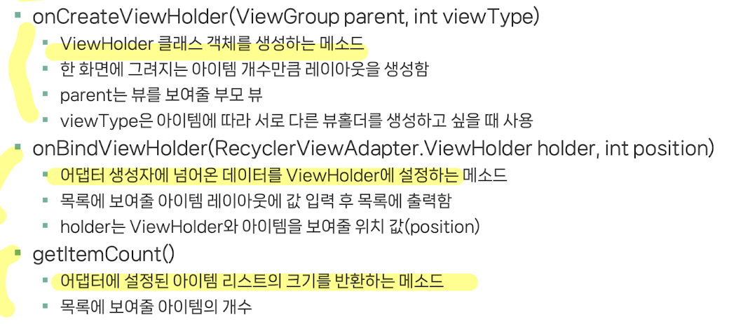 : onCreateViewHolder(), onBindViewHolder(), getItemCount() 메소드를 반드시 정의함