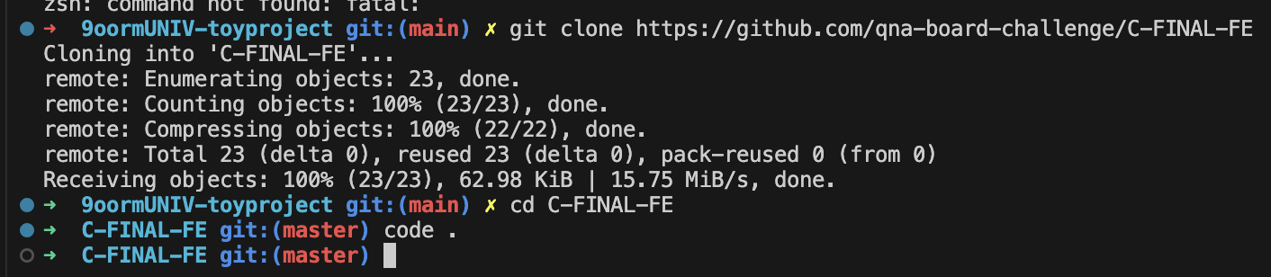git clone https://github.com/(해당깃허브주소) (ex.git clone https://github.com/abc/C-FINAL-FE.git